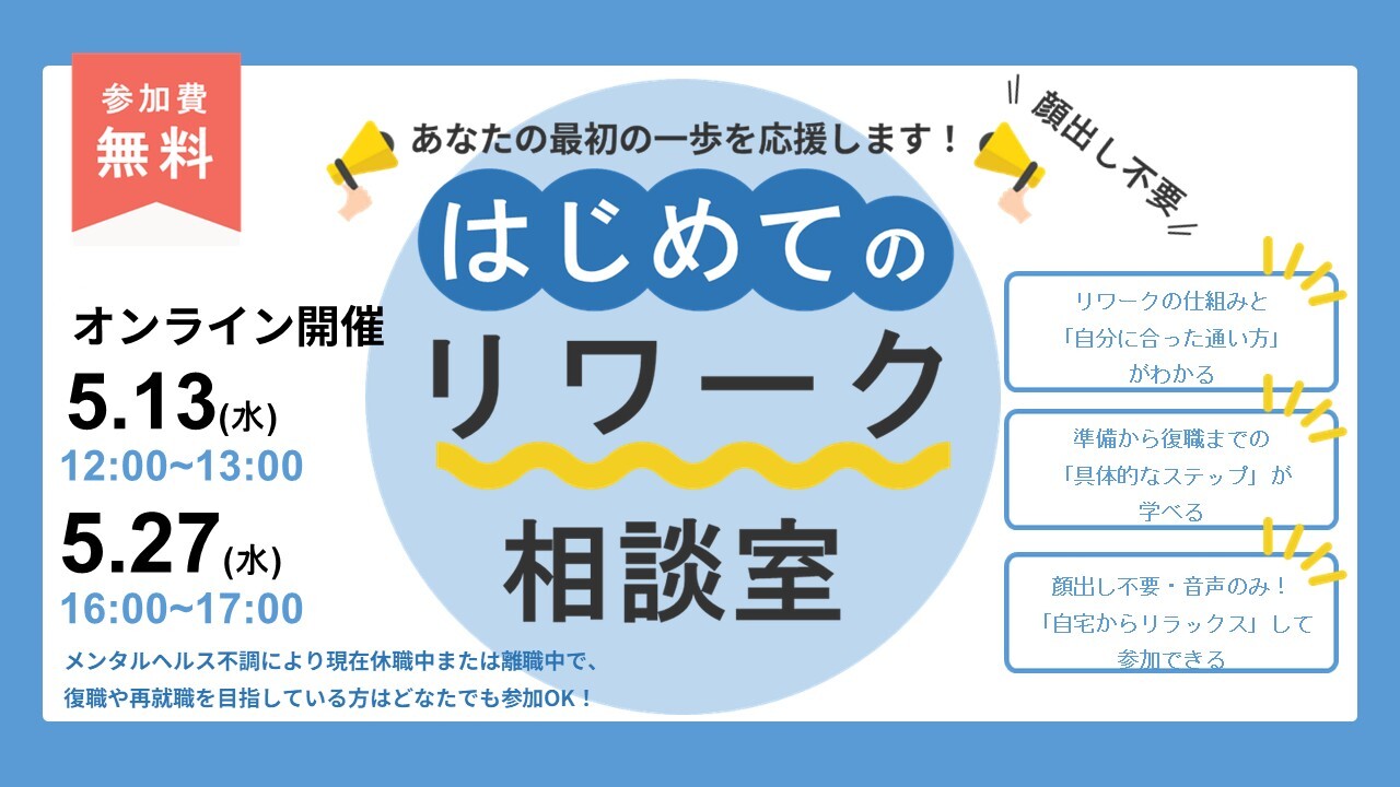 5/13・27開催 はじめてのリワーク相談室|オンライン【無料・予約制】